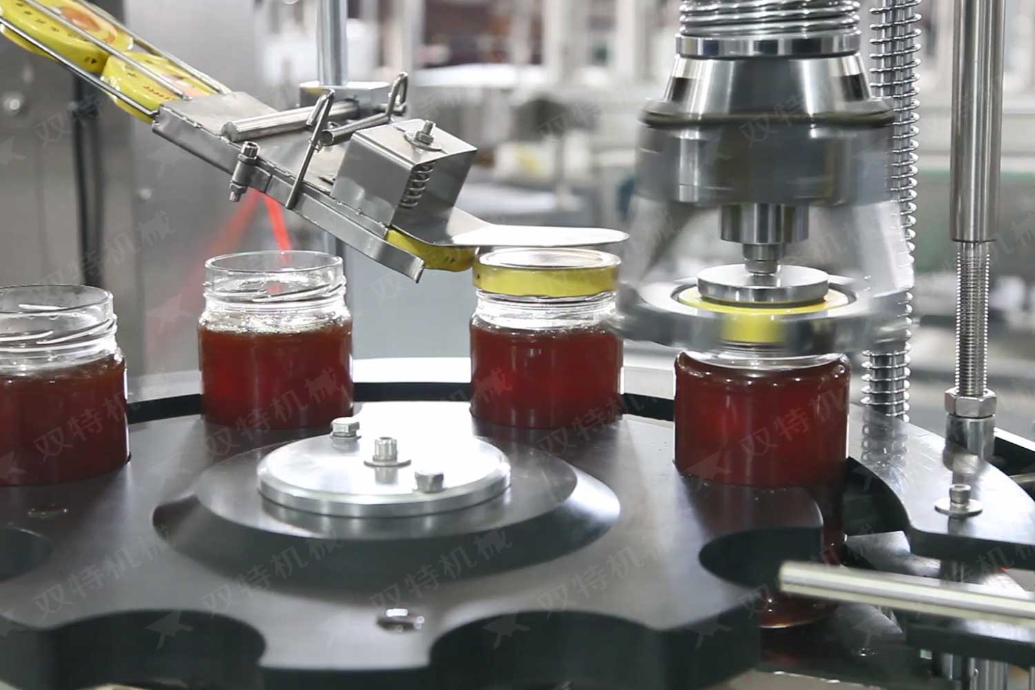 旋蓋機(jī)主要用于玻璃廣口瓶的三、四、六鐵蓋真空旋蓋,用兩根不同速度的皮帶壓瓶蓋,因兩根皮帶的速度不同,對(duì)蓋進(jìn)行搓蓋收緊達(dá)到旋蓋目的。在自動(dòng)上蓋之前對(duì)瓶口吹蒸汽加熱,吹掉冷空氣,換上高溫蒸汽,立即旋蓋,根據(jù)熱脹冷縮原理,蒸汽冷下來(lái)就自然形成了瓶?jī)?nèi)真空,達(dá)到了真空旋蓋的目的。自動(dòng)旋蓋機(jī)可以和濃醬灌裝機(jī)、蜂蜜灌裝機(jī)、辣椒醬灌裝機(jī)組合在一起,形成一套全自動(dòng)灌裝設(shè)備,是現(xiàn)代調(diào)味品企業(yè)的得力幫手。